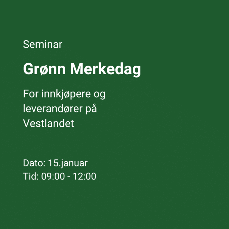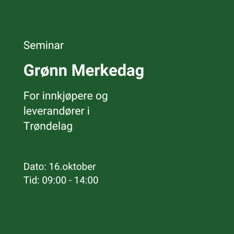 Arrangementer Nettverkssamling: Sammen får vi fart på miljømerkede innkjøpNyhet | arrangement nettverk for miljømerket innkjøp 13.10.2025 Nordisk webinar: Innkjøpere krever miljømerkede arbeidsklær og tekstilerNyhet | arrangement nettverk for miljømerket innkjøp 10.09.2025 Velkommen til Grønn Merkedag TrøndelagNyhet | Arrangementer 03.09.2025 Frokostseminarer: Miljøkrav i offentlige anskaffelserNyhet | arrangement nettverk for miljømerket innkjøp 20.08.2025 Arendalsuka 2025: Cocktailen av kjemikalier ingen vil ha (men kjøper likevel)Nyhet | Kjemikalier og miljøgifter 20.06.2025 Svanemerket til Arendalsuka 2025Nyhet | Arrangementer 23.05.2025 Frokostseminar: Vær presis og ha bevis – effektiv kommunikasjon i tråd med nye EU-reglerNyhet | Arrangementer 30.04.2025 Nettverkssamling: Medisinsk forbruksmateriell og utstyr, renhold, vaskeri og kaffetjenesterNyhet | arrangement nettverk for miljømerket innkjøp 04.03.2025 Webinar: Innføring i svanemerking av nybygg, rehabilitering og bygningsdriftNyhet | Arrangementer 29.01.2025 Webinar: Lansering av nye krav til renholdstjenesterNyhet | Arrangementer 16.12.2024 Webinar: Lansering av nye krav til hudpleie, solkrem, såpe og andre kosmetiske produkterNyhet | Arrangementer 05.12.2024 Grønn Merkedag VestlandetNyhet | Arrangementer 29.11.2024 Forbrukermakt og markedsføringNyhet | Markedsføring og kommunikasjon 15.11.2024 Webinar: Lansering av nye krav til bygningsdriftNyhet | Arrangementer 04.10.2024 Svanemerket på Arendalsuka 2024Nyhet | Arrangementer 01.07.2024 Arendalsuka 2024: 4000 offentlige milliarder – de grønne muligheters markedNyhet | Arrangementer 19.06.2024 Arendalsuka 2024: Makta! 27 millioner har talt – forbrukermakta rårNyhet | Arrangementer 19.06.2024 Arendalsuka 2024: Må byggebransjen på rehab? Vi snur verdens mest klimavennlige byggesteinNyhet | Arrangementer 19.06.2024 Seminar: 450 nye skoler og barnehager: Hvordan bygger vi for fremtiden?Nyhet | Arrangementer 16.04.2024 Webinar: Lansering av nye krav til vaskehaller for kjøretøyNyhet | Arrangementer 04.04.2024 Webinar: EUs grønne giv og grønnvaskingNyhet | Arrangementer 10.01.2024