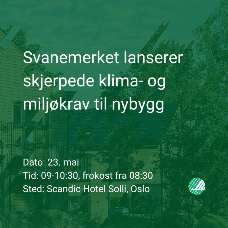 style="object-position: 21% 48%" Bolig og andre bygg Et svanemerket bygg har høy kvalitet og lav miljøbelastning Miljøsertifisering av bolig og andre byggAlt om kravene som må oppfylles og hvordan du søker Miljøkrav ved anskaffelse av byggKonkrete miljøkrav profesjonelle innkjøpere kan benytte Svanemerkede bygg Oversikt over alle svanemerkede bygg i Norge artikkel | Bolig og andre bygg Hva kjennetegner et svanemerket bygg? 15. august 2023 artikkel | Sirkulær økonomi Sirkulær økonomi i byggebransjen 31. oktober 2023 artikkel | Bolig og andre bygg Byggfloken: Nytenking for en mer bærekraftig byggenæring 15. august 2023 artikkel | Bolig og andre bygg Derfor er det godt inneklima i et svanemerket bygg 12. juni 2024 artikkel | Bolig og andre bygg Skadelige kjemikalier du unngår i et svanemerket bygg 13. mars 2024 artikkel | Grønne anskaffelser Derfor bør kommunen din bygge svanemerkede skoler, barnehager og omsorgsbygg 12. juni 2024 artikkel | Bolig og andre bygg Svanemerket rehabilitering av bygg: Godt valg for klima, miljø og sirkulær økonomi 9. februar 2024 Nyheter Fra museum til lager – nå kan flere bygg svanemerkesNyhet | Bolig og andre bygg 27.08.2025 Riving var aldri et alternativ – Nå er bygget svanemerketNyhet | Bolig og andre bygg 06.02.2025 Webinar: Innføring i svanemerking av nybygg, rehabilitering og bygningsdriftNyhet | Arrangementer 29.01.2025 Nå kan bygningsdrift bli SvanemerketNyhet | Bolig og andre bygg 10.10.2024 Nye byggkrav: Svanemerket effektiviserer arbeidet med EUs taksonomiNyhet | Bolig og andre bygg 23.05.2023 Svanemerket lanserer sterkt skjerpede krav til nybyggNyhet | Bolig og andre bygg 24.04.2023 Hold deg oppdatert med Svanemerkets nyhetsbrevVi sender deg grønne nyheter, tips og råd