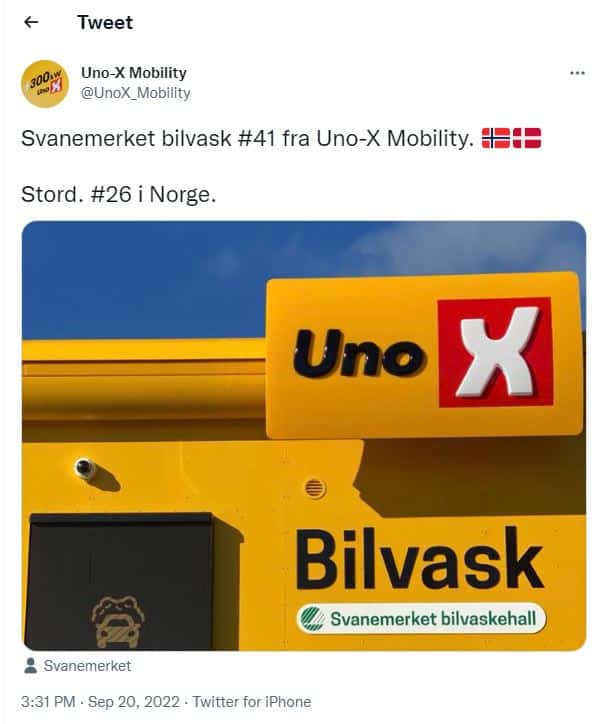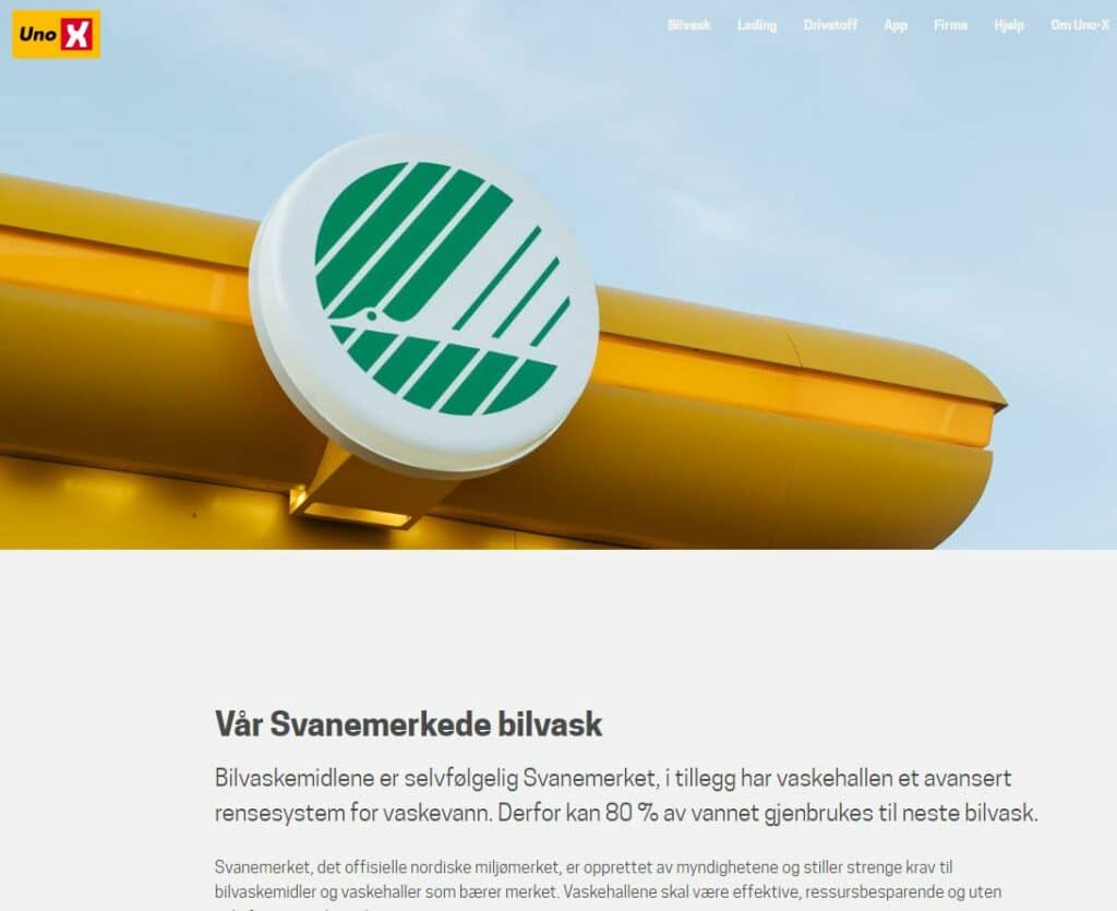 Svanemerket er godt synlig på vaskehallene, og Uno-X kommuniserer tydelig om egenskapene og fordelene ved svanemerket bilvask på nettsider, sosiale medier og i presse.