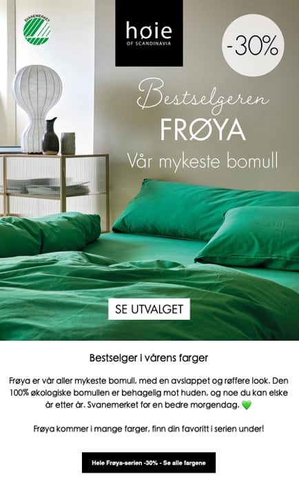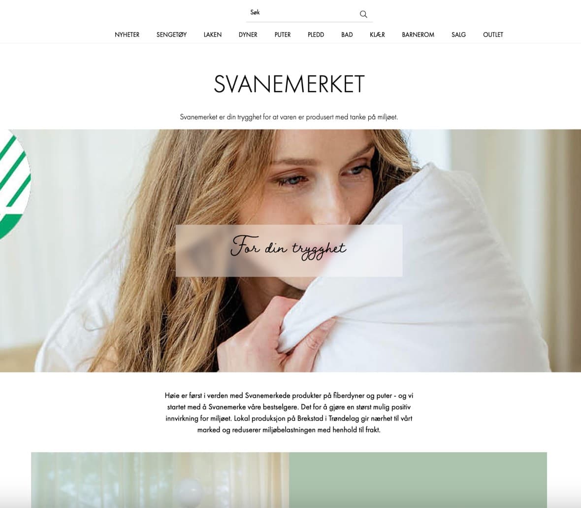 – Det krever mye å få Svanemerket. Å vinne denne prisen er en fin anerkjennelse for arbeidet som gjøres i bedriften, særlig innenfor produktutvikling og markedskommunikasjon. Vi er stolte av å ha Svanemerkede produkter i vårt sortiment, og er opptatt av å få vist det frem. Når dynen, puten eller sengesettet fra Høie er Svanemerket, slipper kunden selv å ettergå hvordan varen er produsert og hvor stor miljøbelastning den representerer, avslutter Hansen.